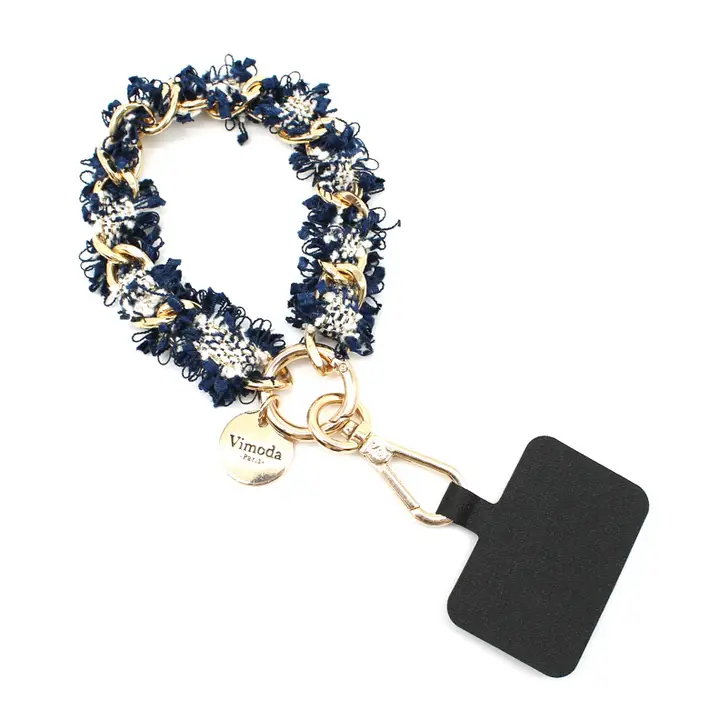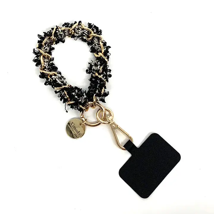 Lyft din vardag med denna eleganta mobilkedja i tweed med detaljer i guldfärgad metall – en perfekt mix av funktion och fashion. Den korta kedjan är designad för att bäras runt handleden eller fästas på väska, byxa eller nycklar, och ger din mobil ett lyxigt uttryck samtidigt som den alltid är nära till hands.