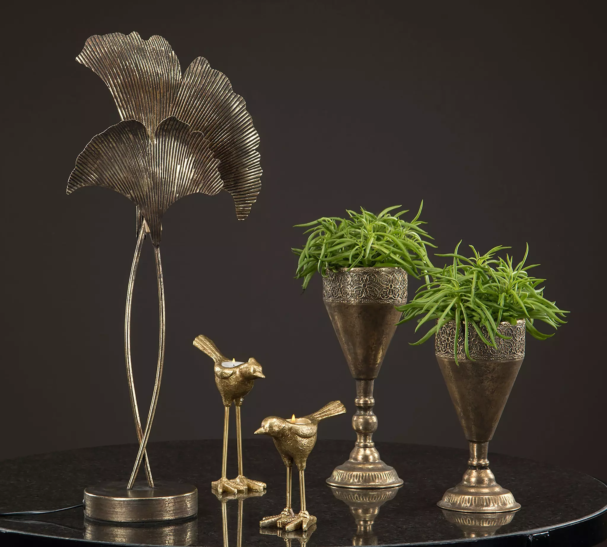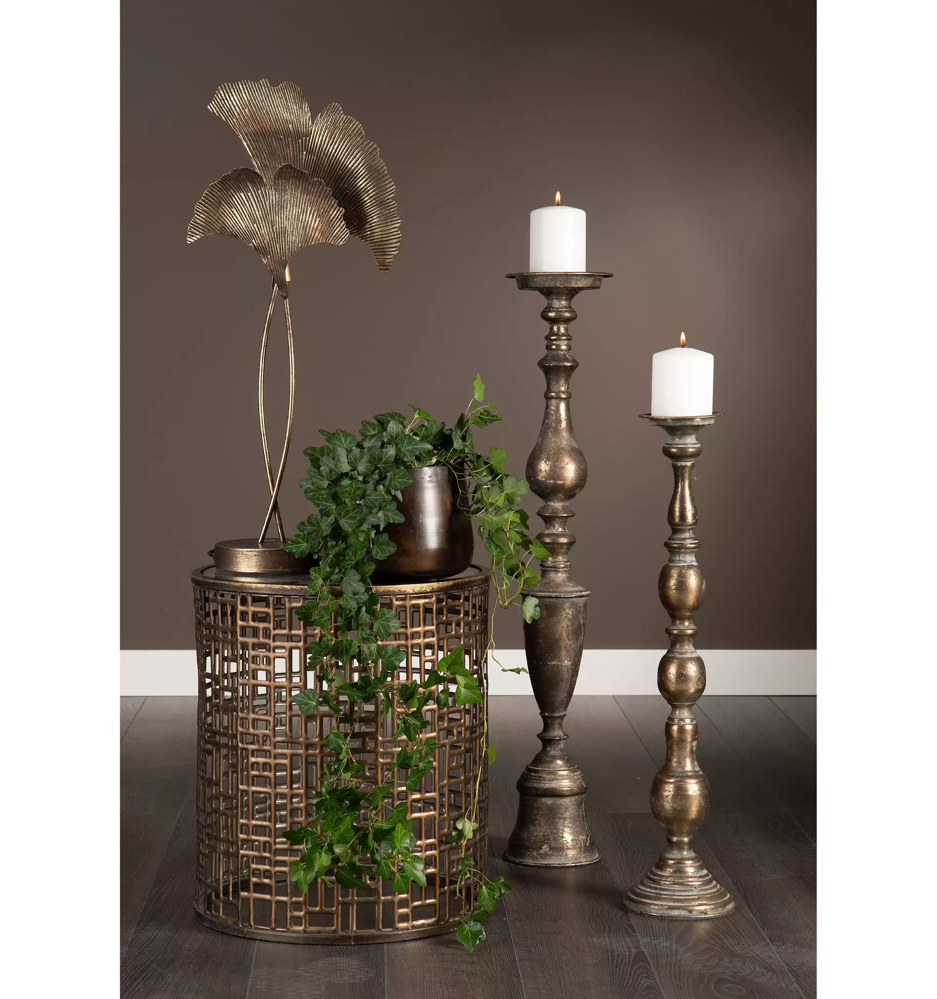 De vackert formade metallbladen skapar ett levande uttryck med struktur och djup. Den bruna finishen ger en varm, nästan antik känsla som passar perfekt i både klassiska och moderna miljöer. Placera den på ett sideboard, i ett fönster eller på ett avlastningsbord för att skapa stämning och karaktär.