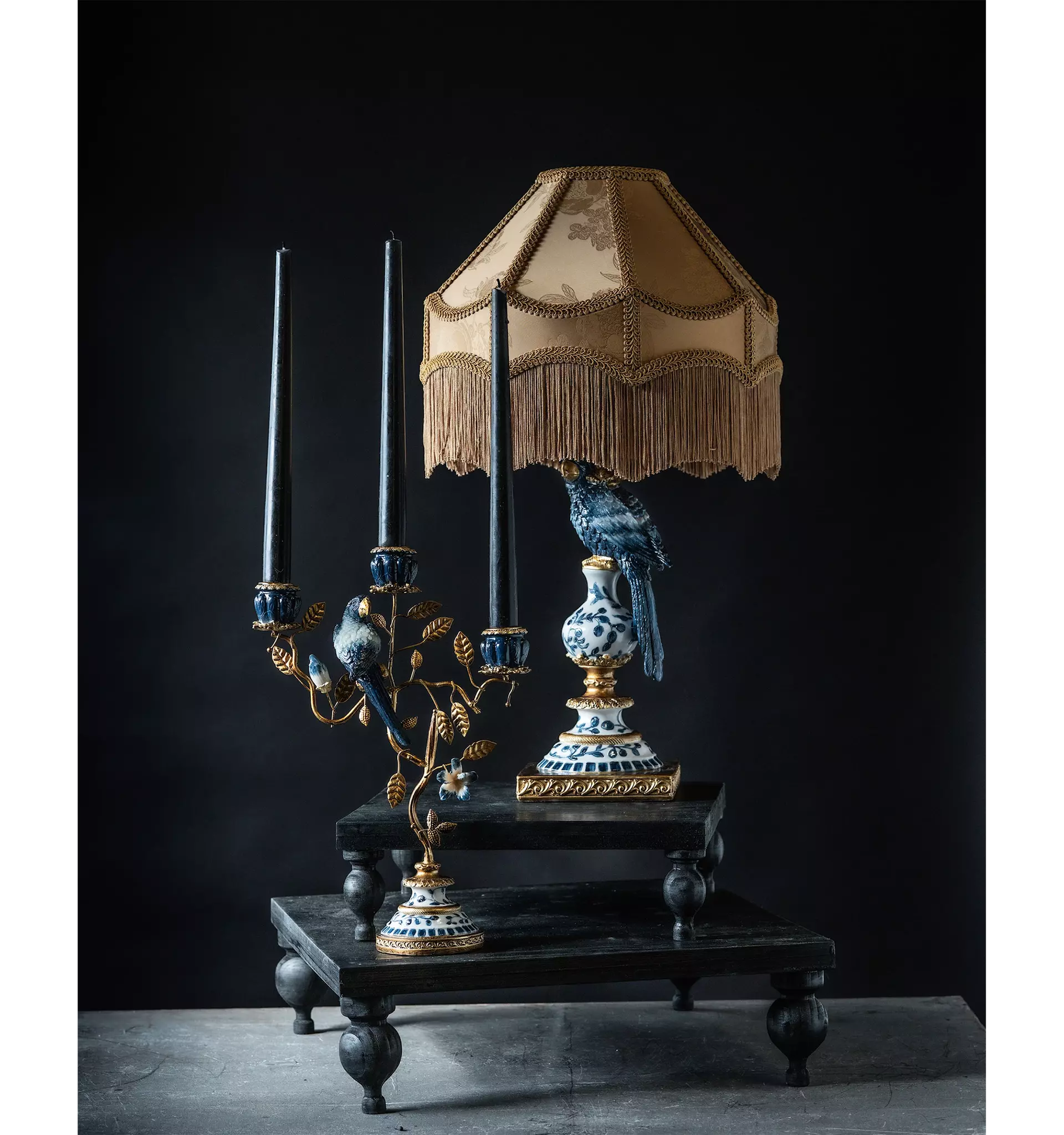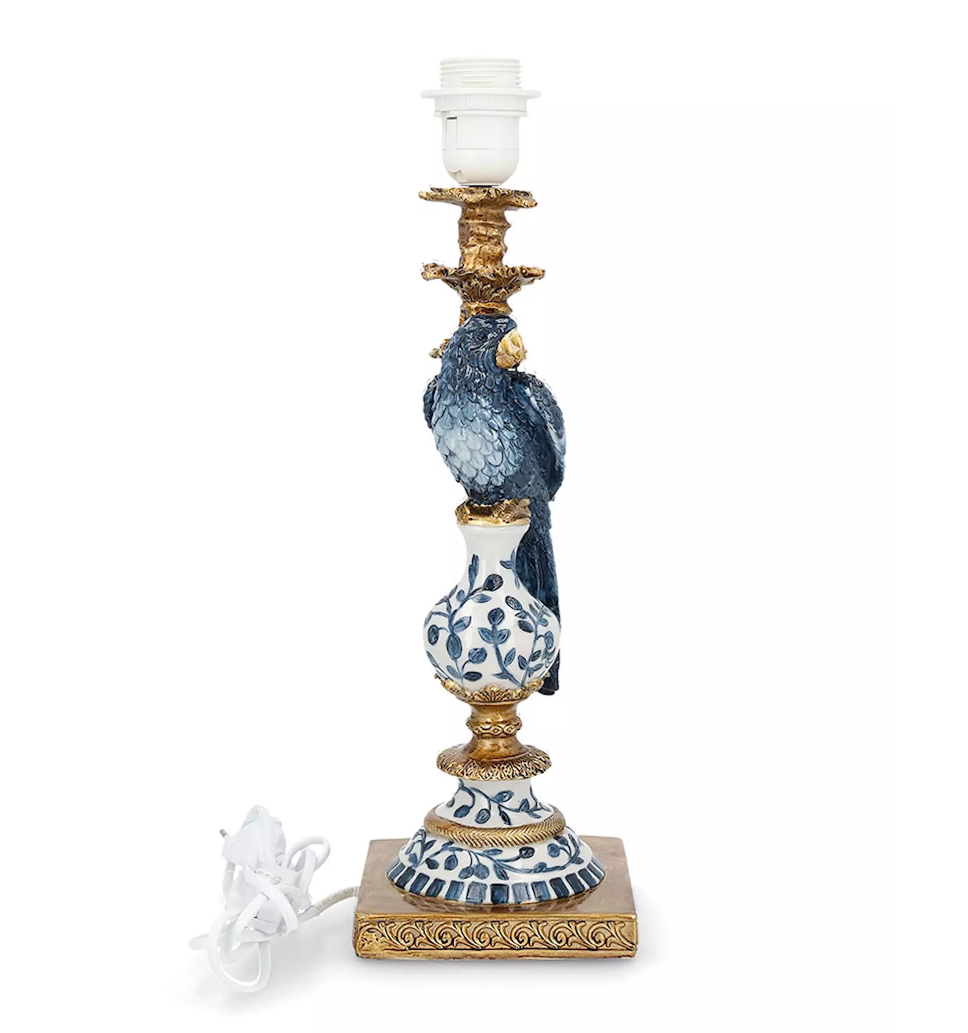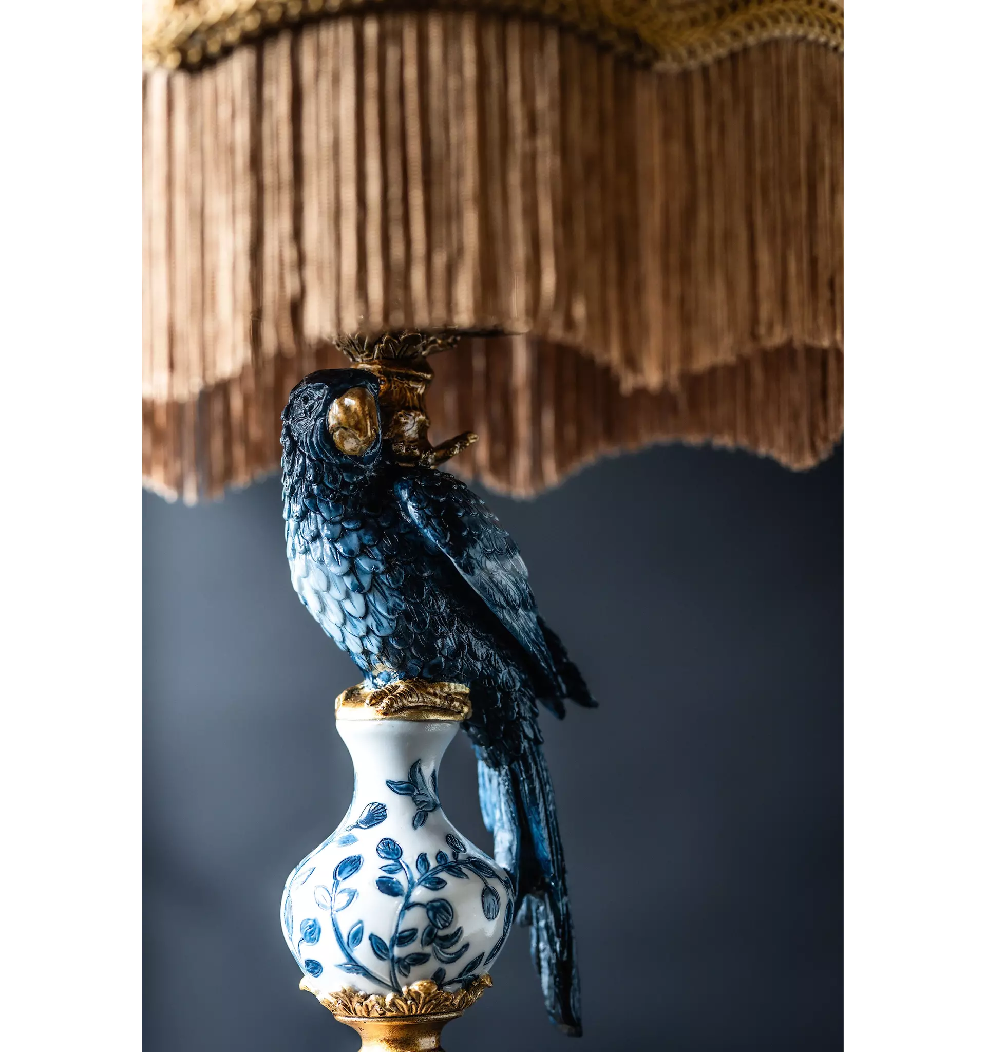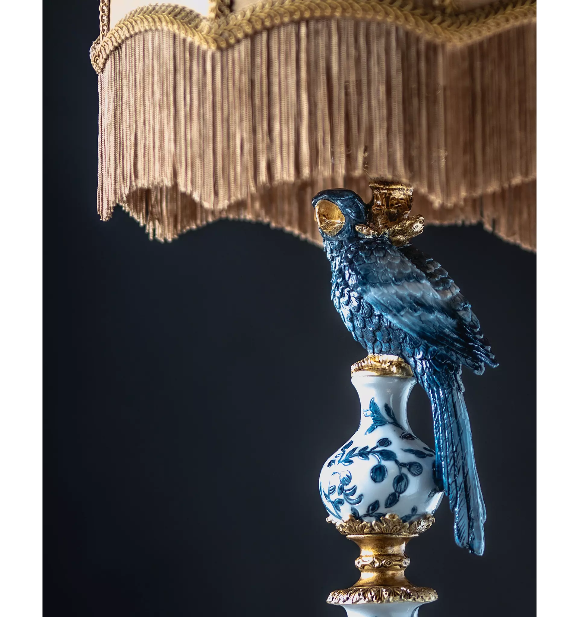 Den detaljrika papegojan i djup blå ton sitter elegant placerad ovanpå en porslinsinspirerad fot med blått bladmönster och guldfärgade detaljer. Kombinationen av blått, vitt och guld ger en exklusiv boutique-känsla och för tankarna till kolonial stil, klassisk europeisk inredning och trendig maximalism.