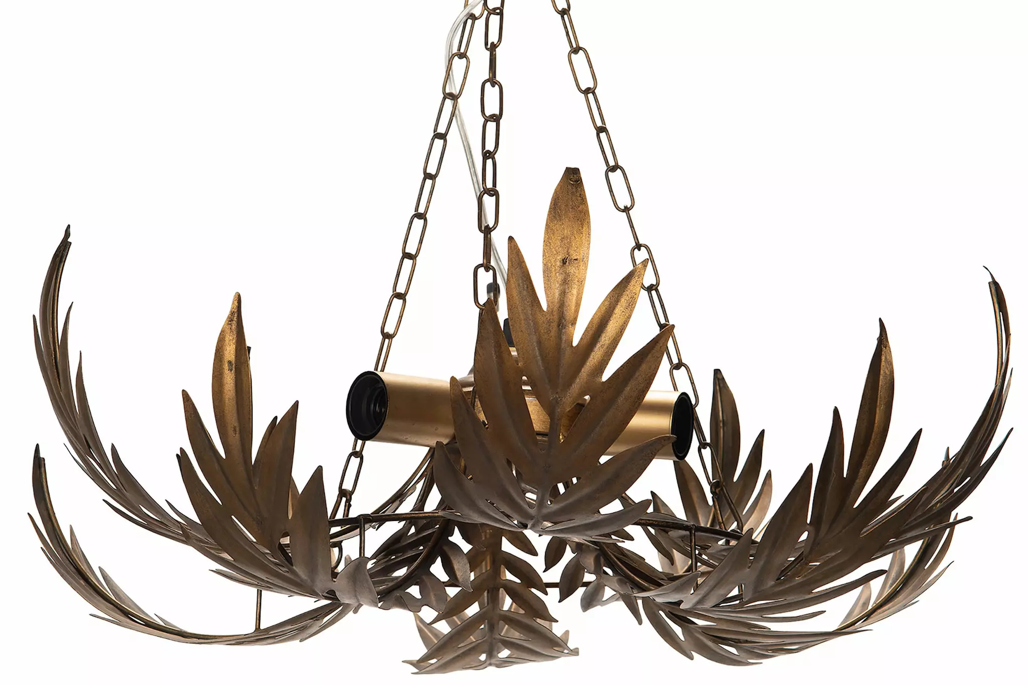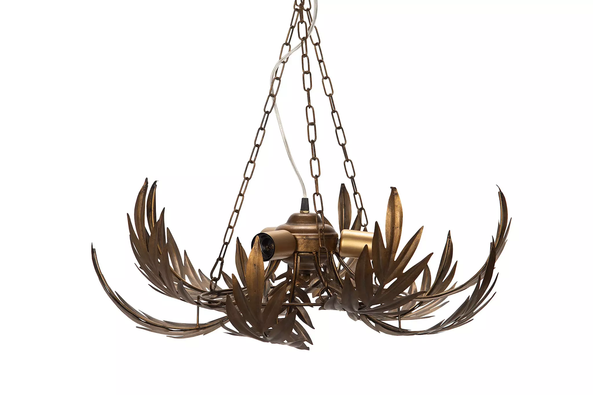 Låt belysningen bli rummets smycke. Denna eleganta takkrona i mässing med dekorativa bladdetaljer är en statement-lampa som ger både karaktär och varm atmosfär till ditt hem. Med sina organiska former och exklusiva finish skapar den en känsla av boutiquehotell, med en touch av art deco och botanisk elegans.