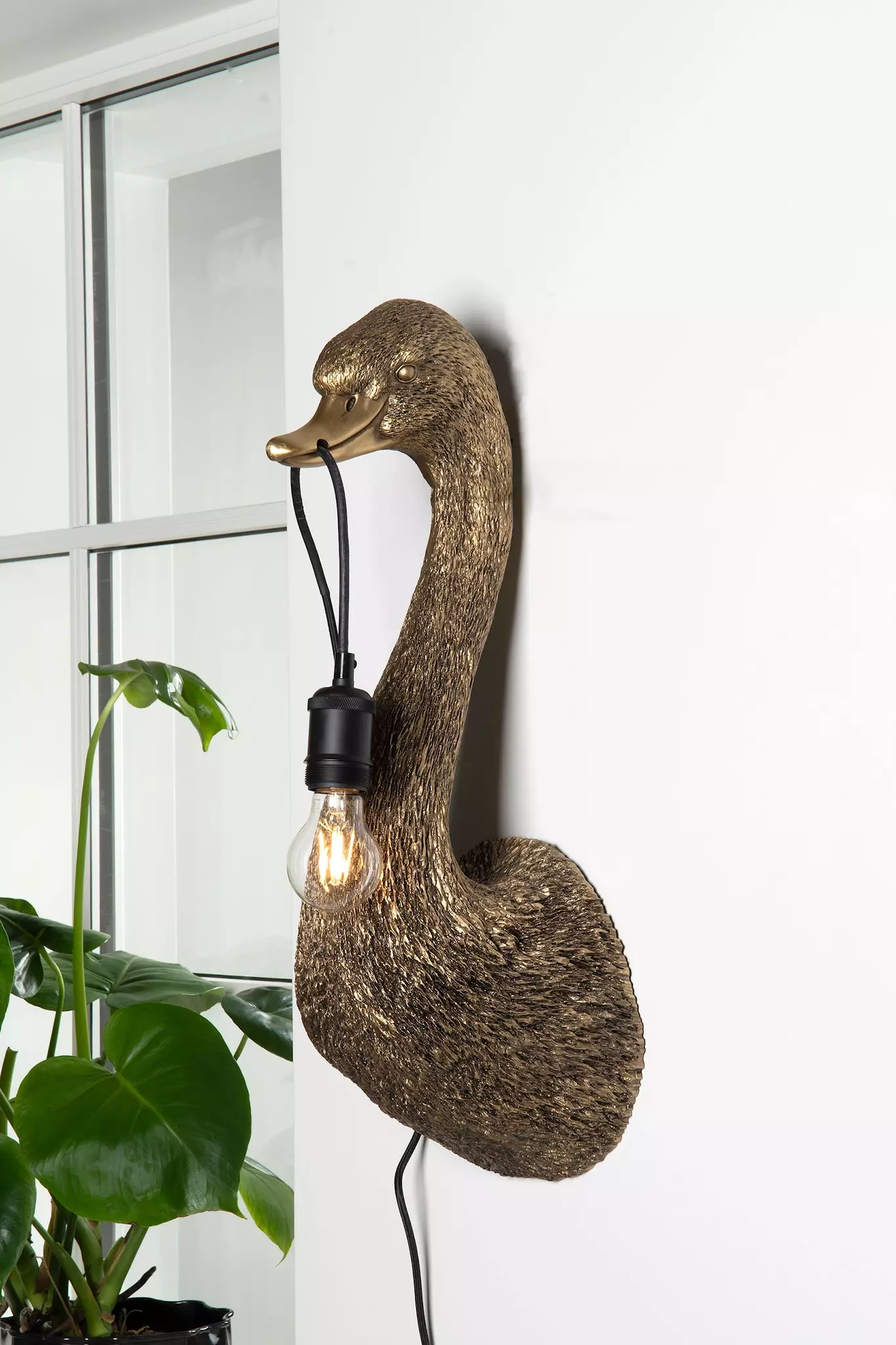 Denna vägglampa formad som en svan i guld är en dekorativ väggbelysning som direkt drar blickarna till sig. Med sin böjda hals och lampsladden vilande i näbben skapas ett lekfullt men samtidigt sofistikerat uttryck.