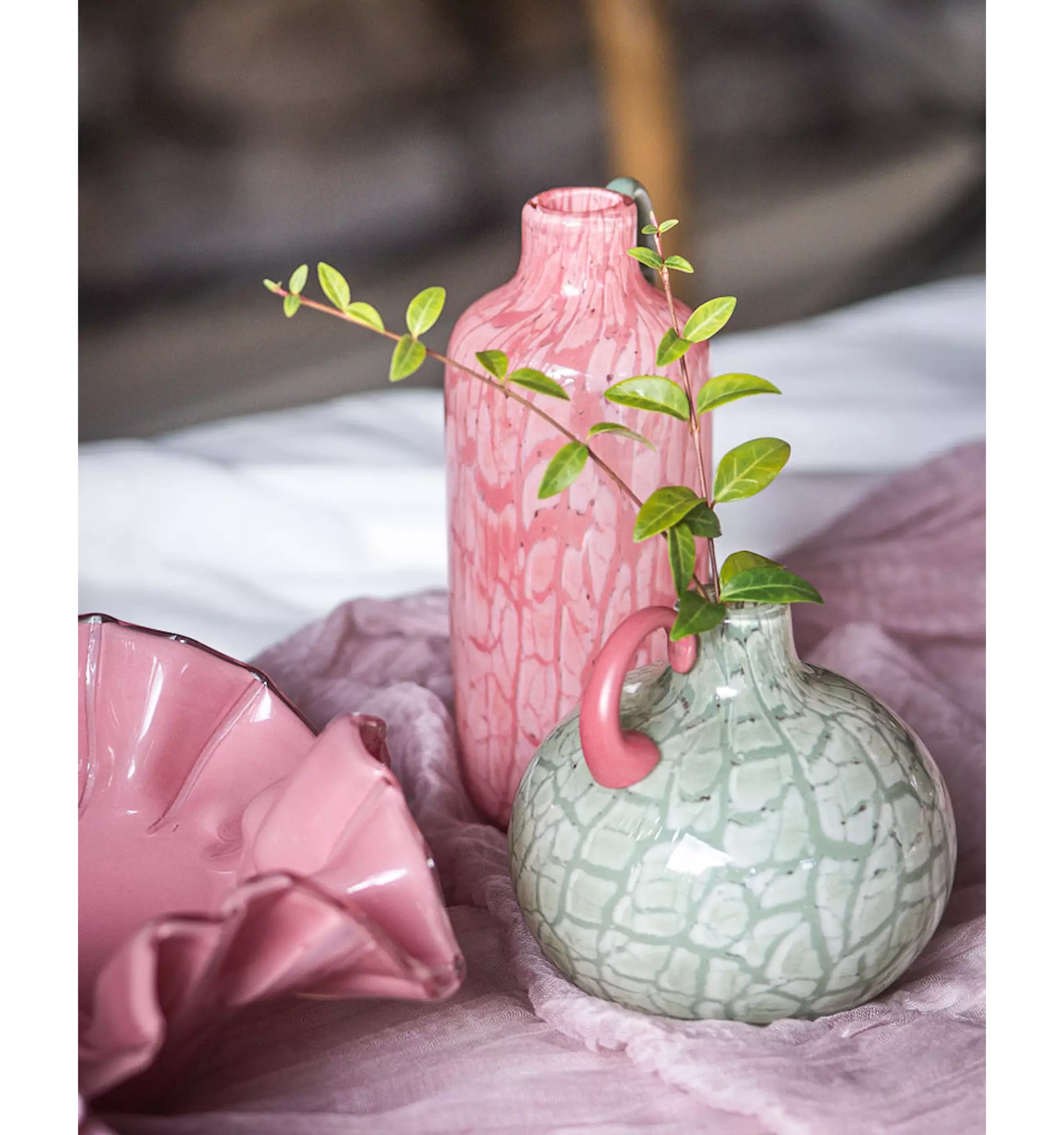 Den vågiga silhuetten reflekterar ljuset vackert och ger liv åt rummet. Oavsett om du stylar den i ett romantiskt sovrum, ett modernt vardagsrum eller ett kreativt ateljéutrymme blir denna blomformade skål i glas en självklar statement-detalj.