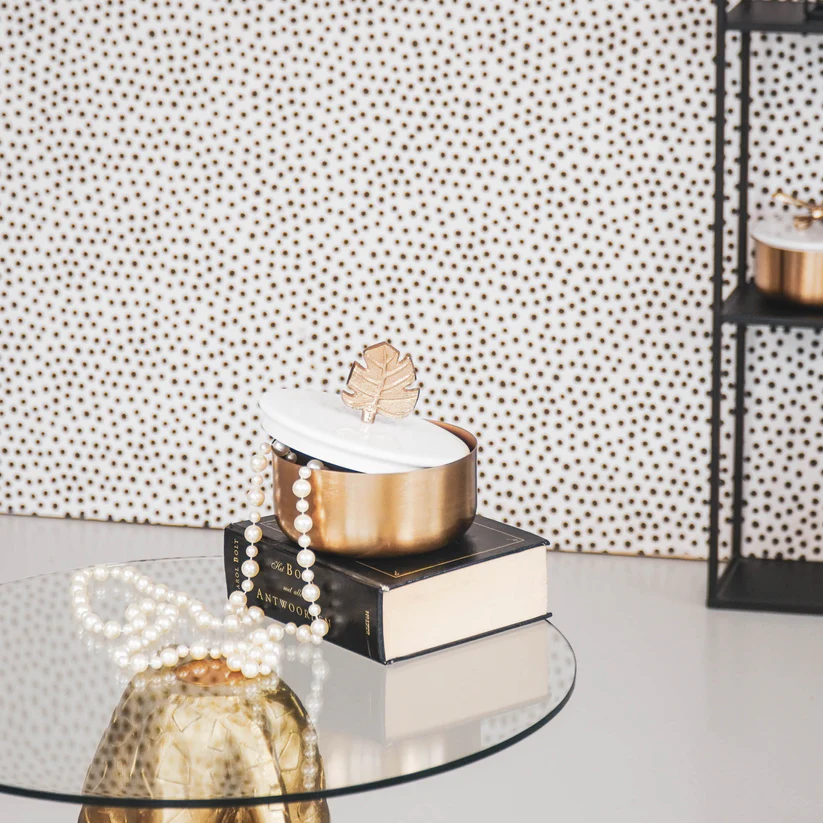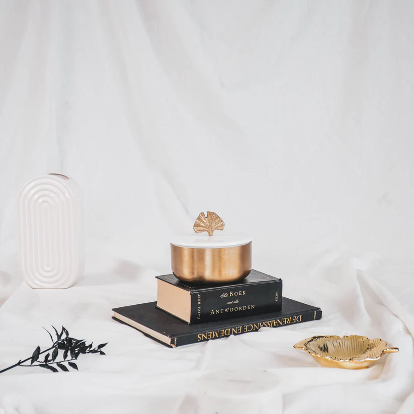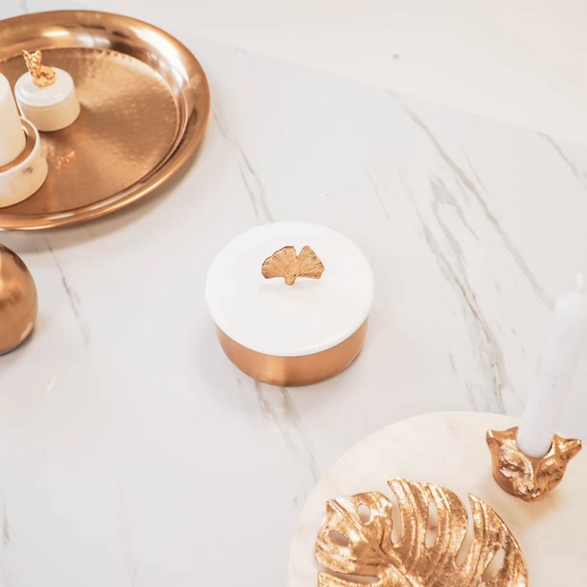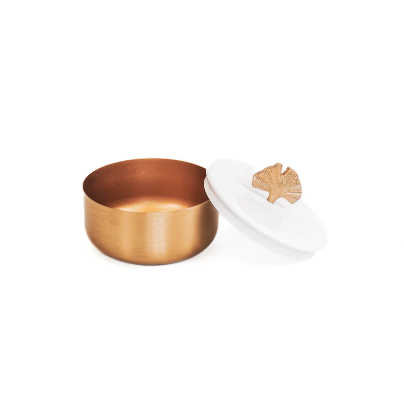 Ditt smyckeskrin ska vara mer än bara en förvaring; det ska vara en konstnärlig detalj som kompletterar din personliga stil. Vårt smyckeskrin i vit och guld, krönt med ett förtjusande litet ginkgo-löv, är den ultimata kombinationen av funktionalitet och skönhet.