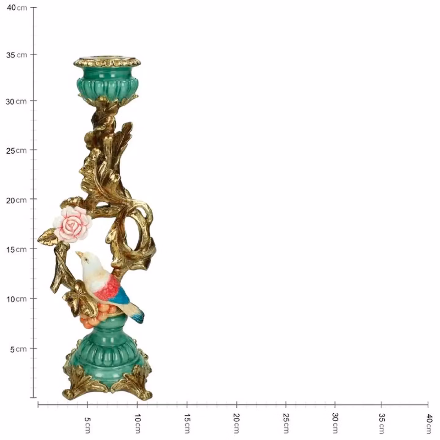 Den detaljerade designen med en vacker fågel och rosor i centrum gör att denna unika ljusstake i klassisk stil smälter in i både bohemisk, vintage och eklektisk inredning. Perfekt att placera i vardagsrummet, på ett sidobord, i en bokhylla eller som ett statement piece i hallen.