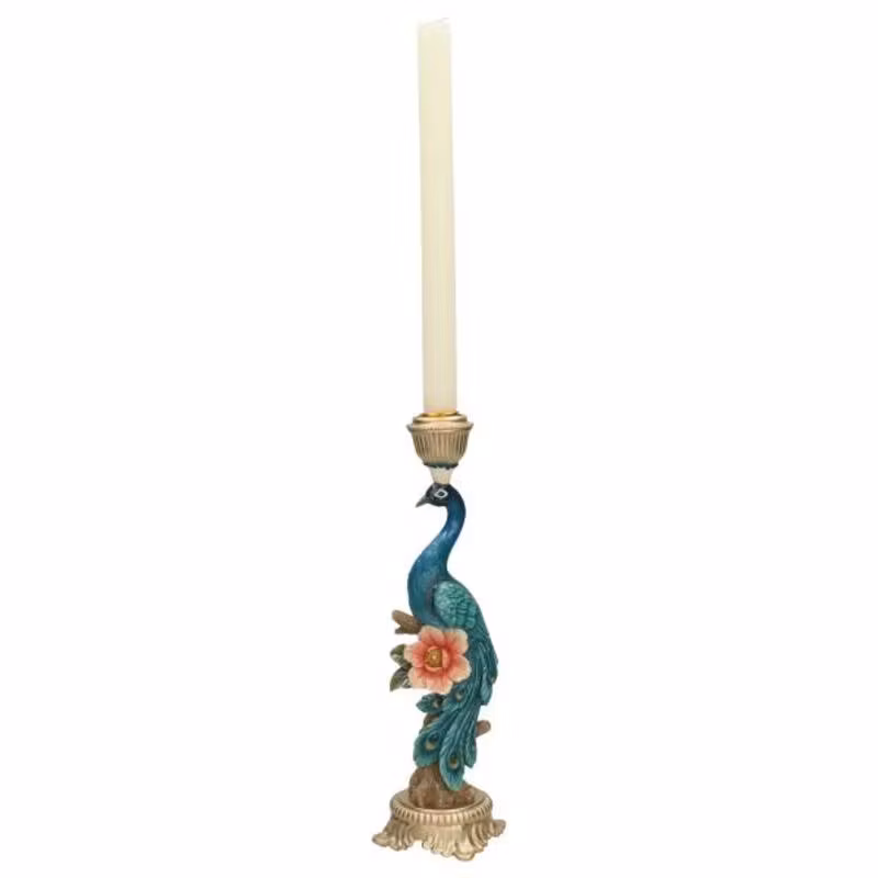 Ljusstaken är utformad som en påfågel sittandes på en gyllene fot, omgiven av blomsterdetaljer, och fungerar både som dekorativ ljushållare och som en konstnärlig skulptur i hemmet. Placera den som centerpiece på matbordet eller i bokhyllan för att skapa en stilren och personlig inredning.